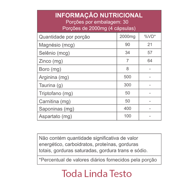 L-arginina, extrato de semente de feno-grego (Trigonella foenum-graecum L.), taurina, magnésio bisglicinato, ácido ascórbico (vitamina C), vitamina E (acetato de DL-alfa-tocoferol), zinco bisglicinato, ácido pantotênico (vitamina B5), vitamina B6 (cloridrato de piridoxina), vitamina B12 (cianocobalamina). Excipientes: amido de milho e dióxido de silício. Composição da cápsula: gelatina e umectante glicerina.